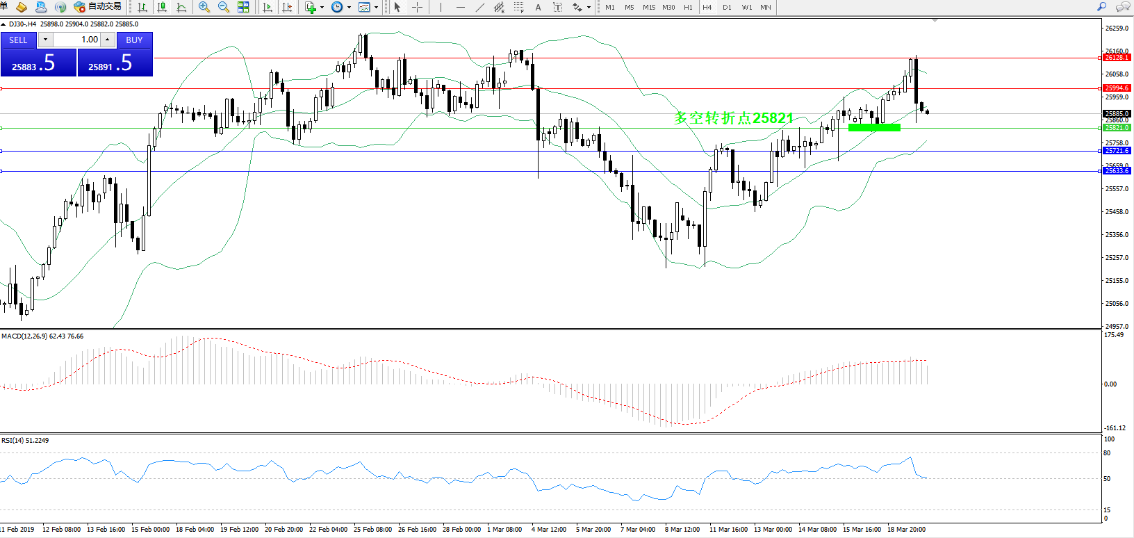 道琼斯指数DJ30—— 4小时K线图显示: