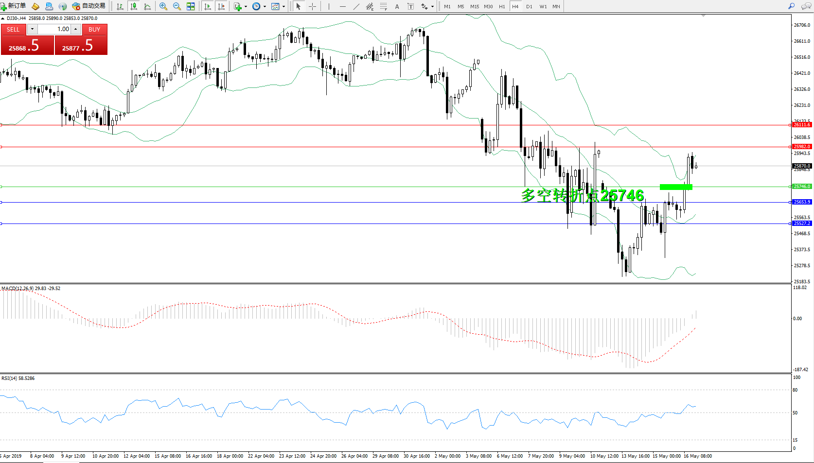 道琼斯指数DJ30—— 4小时K线图显示: