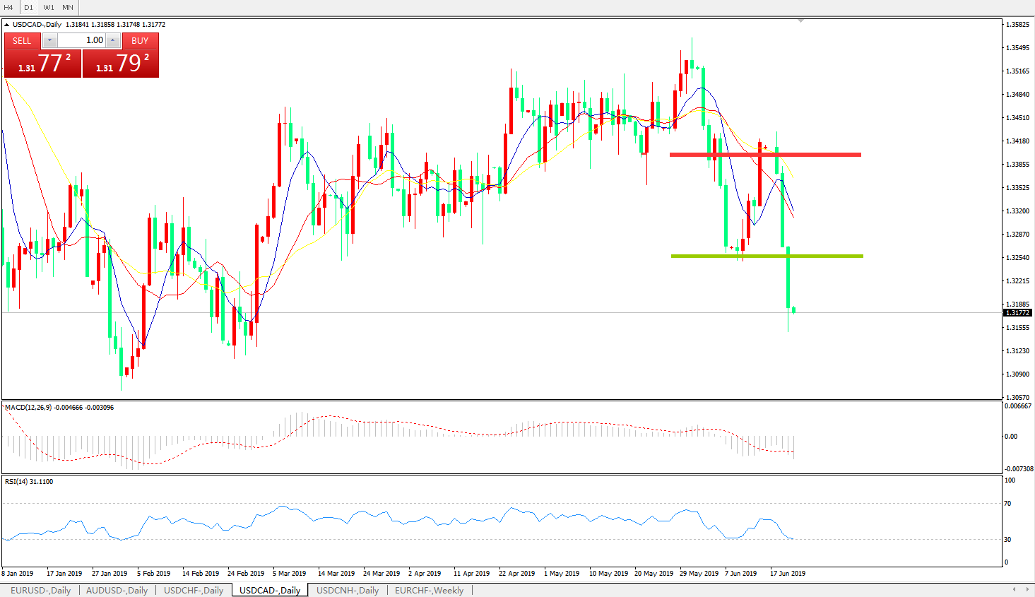 技术面简析:日线图均线开始再度下行价格跌破前低后继续加速下行MACD在0轴下方运行且动能柱再度放量RSI继续走低,预计汇价将进一步下行