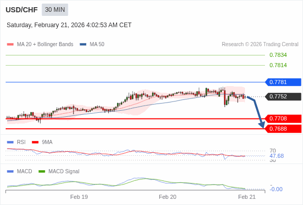 美元/瑞郎 当日内 : 看跌,在 0.7781 之下。