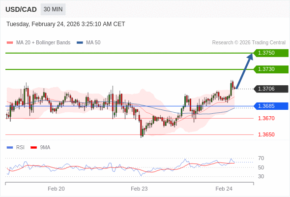 在 1.3685 之上,看涨,目标价位为 1.3730 ,然后为 1.3750 。