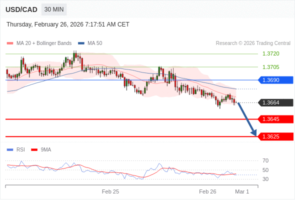 美元/加元 当日内: 朝1.3645运行。