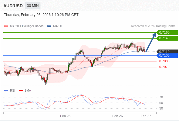 在 0.7100 之上,看涨,目标价位为 0.7145 ,然后为 0.7160 。