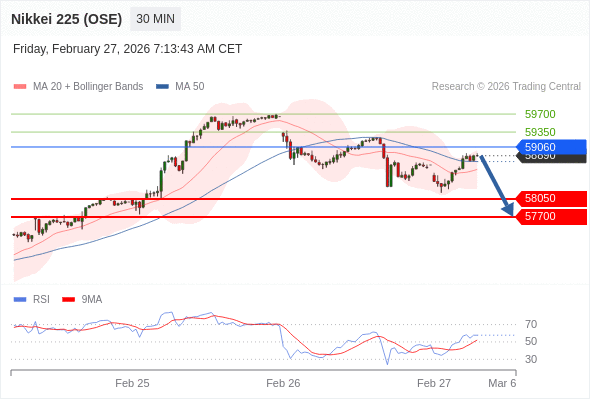 在 59060 之下,看跌,目标价位为 58050 ,然后为 57700 。