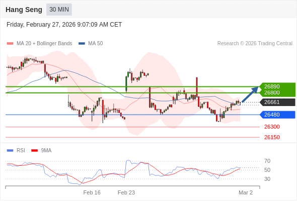 恒生指数 当日内: 上升。