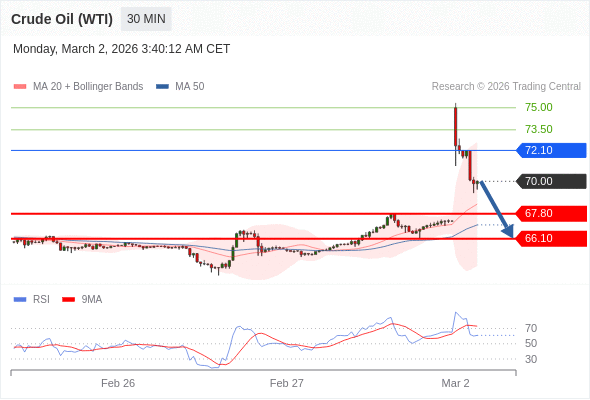 交易策略: 在 72.10 之下,看跌,目标价位为 67.80 ,然后为 66.10 。