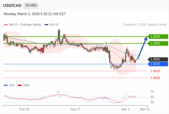 在 1.3635 之上,看涨,目标价位为 1.3680 ,然后为 1.3695 。
