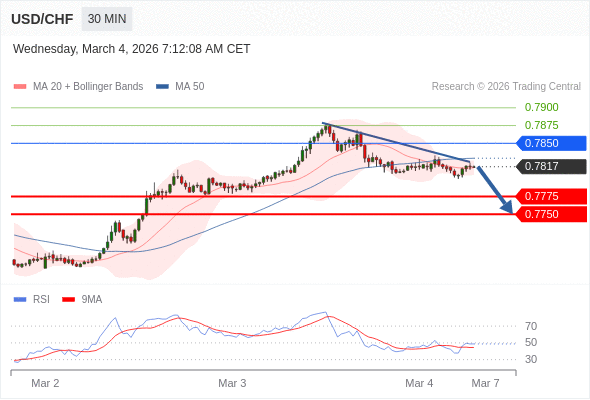 在 0.7850 之下,看跌,目标价位为 0.7775 ,然后为 0.7750 。