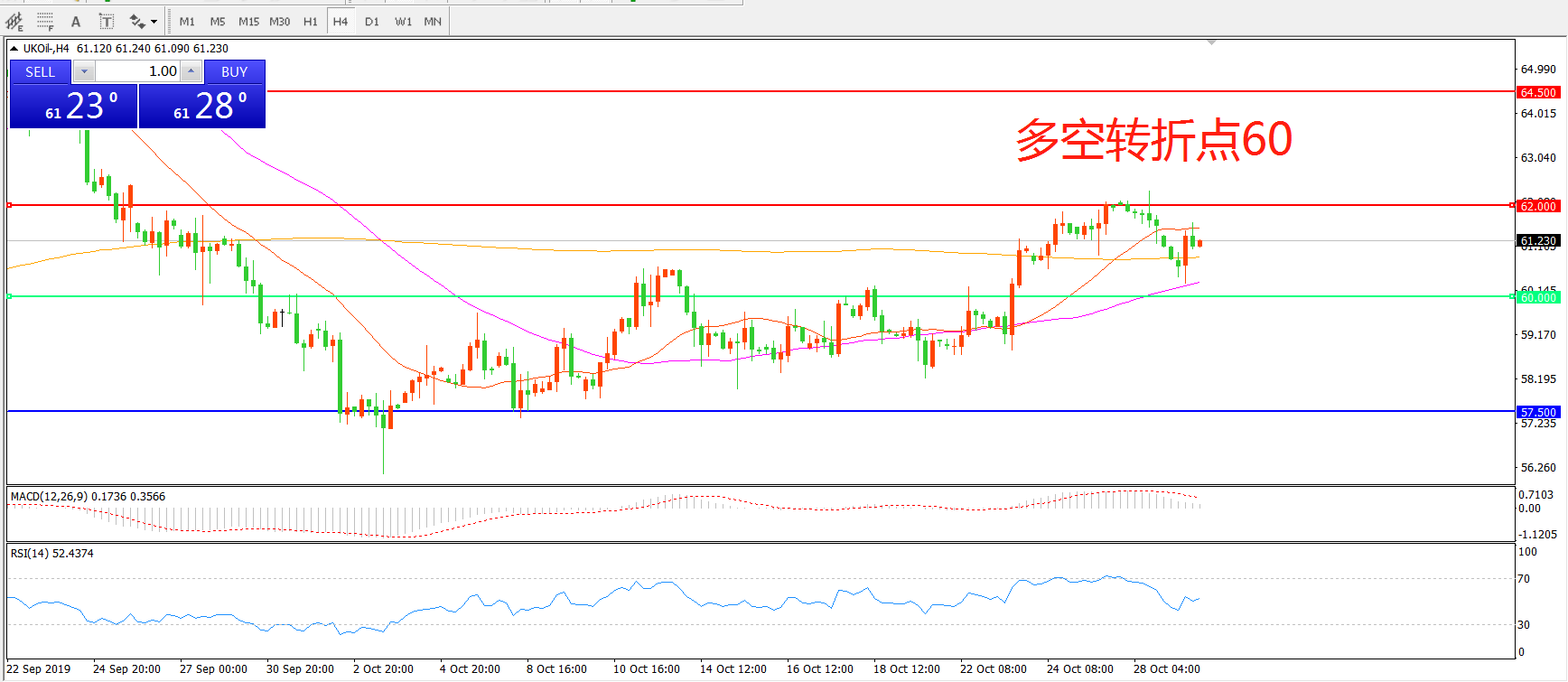 4小时图看,油价呈现冲高回落走势,62美元成为上方阻力,55均线成为下方支撑,均线系统走平,MACD红柱减少,RSI指标走平,日内延续震荡概率较大。