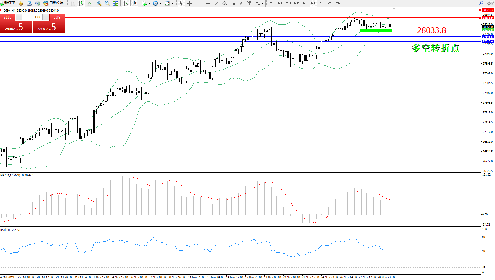 道琼斯指数DJ30—— 4小时K线图显示: