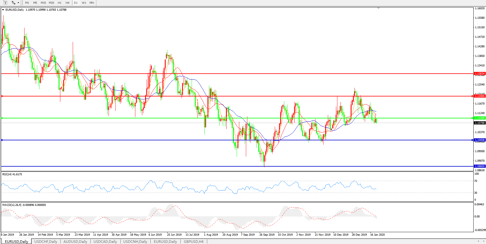 技术面简析:日图均线呈有序空头排列,汇价持续承压1.11关口,MACD下穿0轴且量能0轴下方继续放量 ,RSI缓步走低,预计短期汇价大概率将进一步走低。