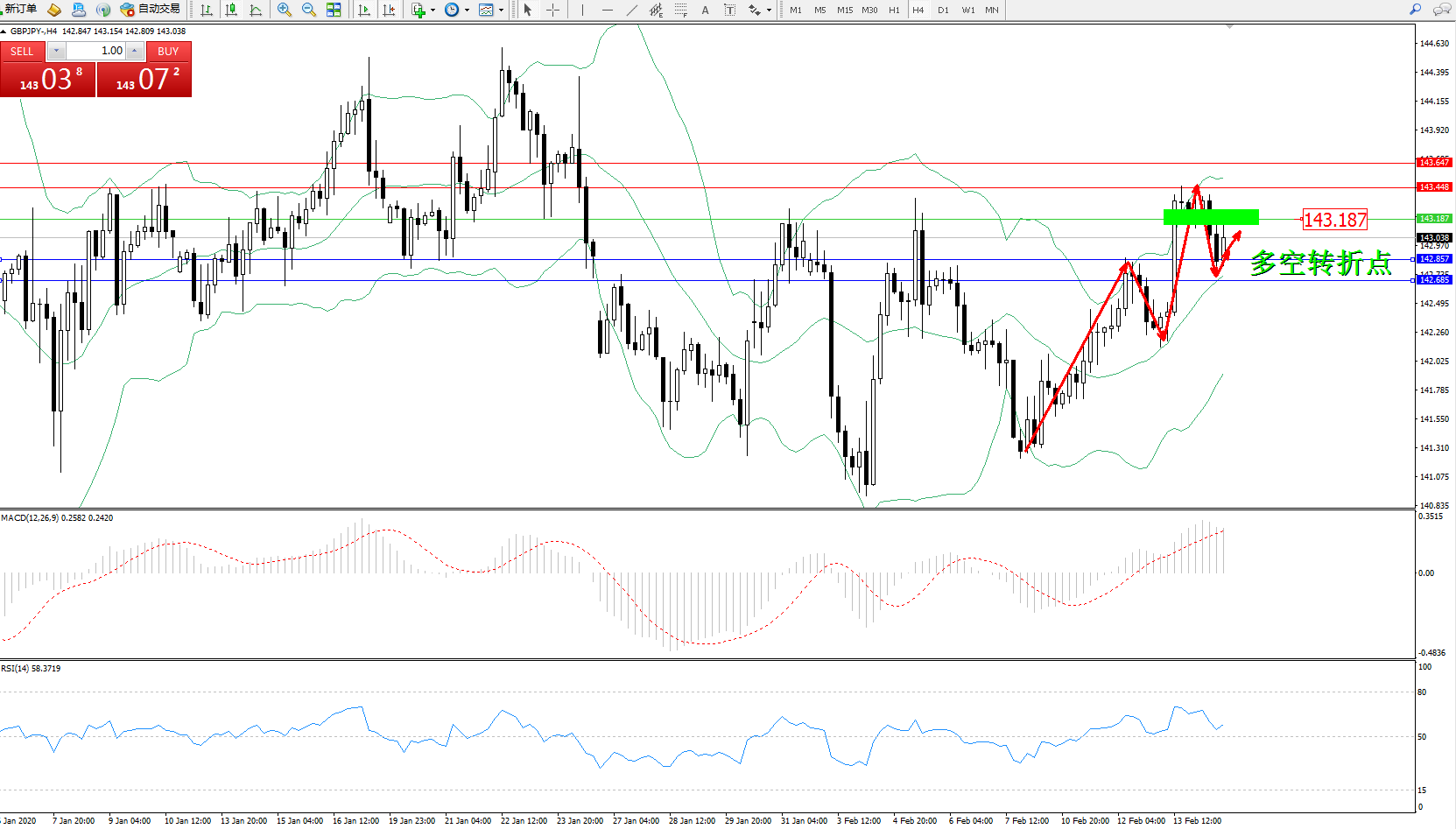 交易策略:143.187下方看跌,目标142.857142.685