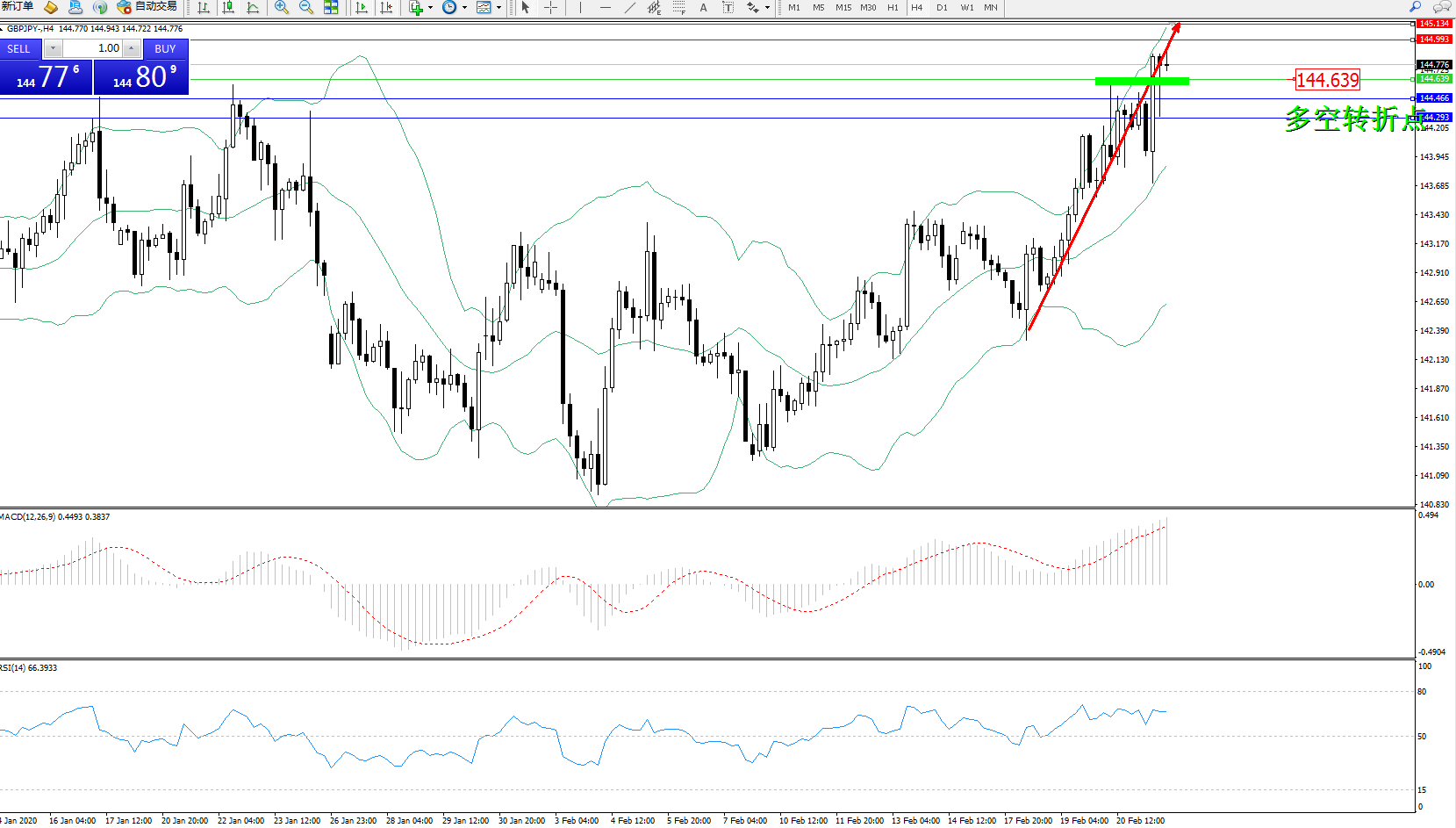 交易策略:144.639上方看涨,目标144.466、144.293