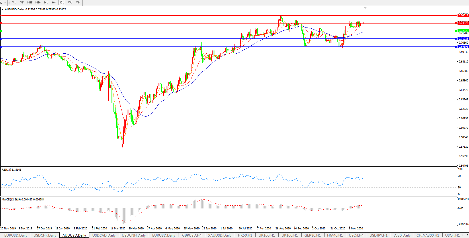 西太平洋银行表示,澳元兑美元上行将遇阻于0.7350,下行方面,跌破0.72将是买入机会,疫苗消息、主要新兴市场国家钢材产量创纪录水平导致铁矿石、大宗商品需求达到纪录高位,以及澳洲联储主席洛威关于澳大利亚仍极不可能实施负利率的言论等综合利好因素,在最近几个交易日提振澳元;依然认为美国和欧洲将实施新的封锁举措和居家令,目前澳元兑美元受阻于0.7350,有迹象表明,亚洲各国央行对近期的货币走强感到担忧,也对澳元上行构成阻力