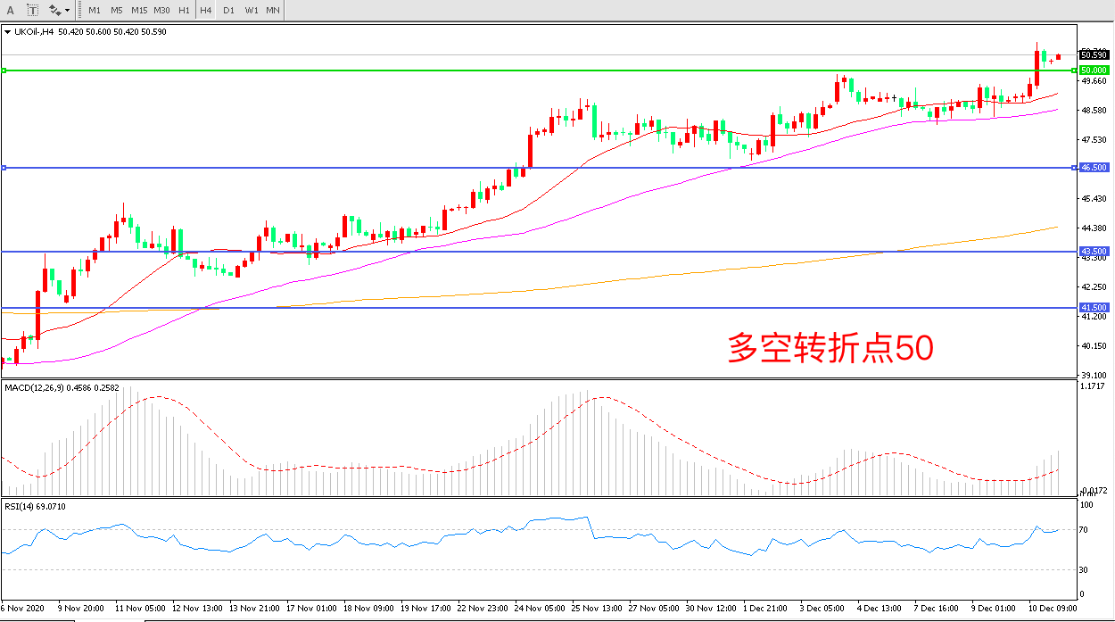 4小时图看,油价长阳拉升强势突破前期整理区间50美元成为中期多空分水岭均线系统有拐头迹象MACD红柱增加RSI指标走平,日内延续上行概率较大。