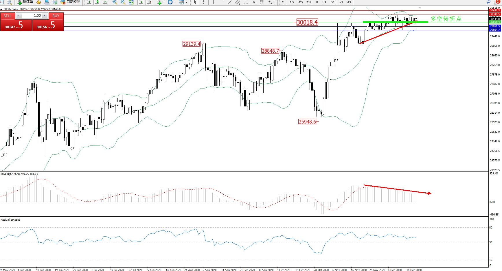 道琼斯指数DJ30—— 日K线图显示: