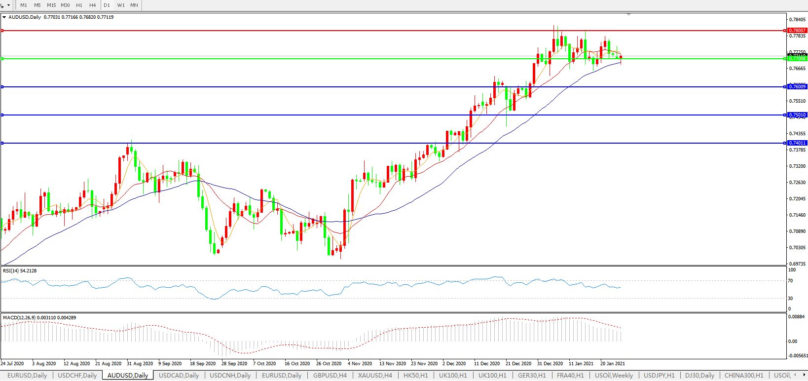 备选策略:0.7700下方看跌,目标0.7600、0.7500