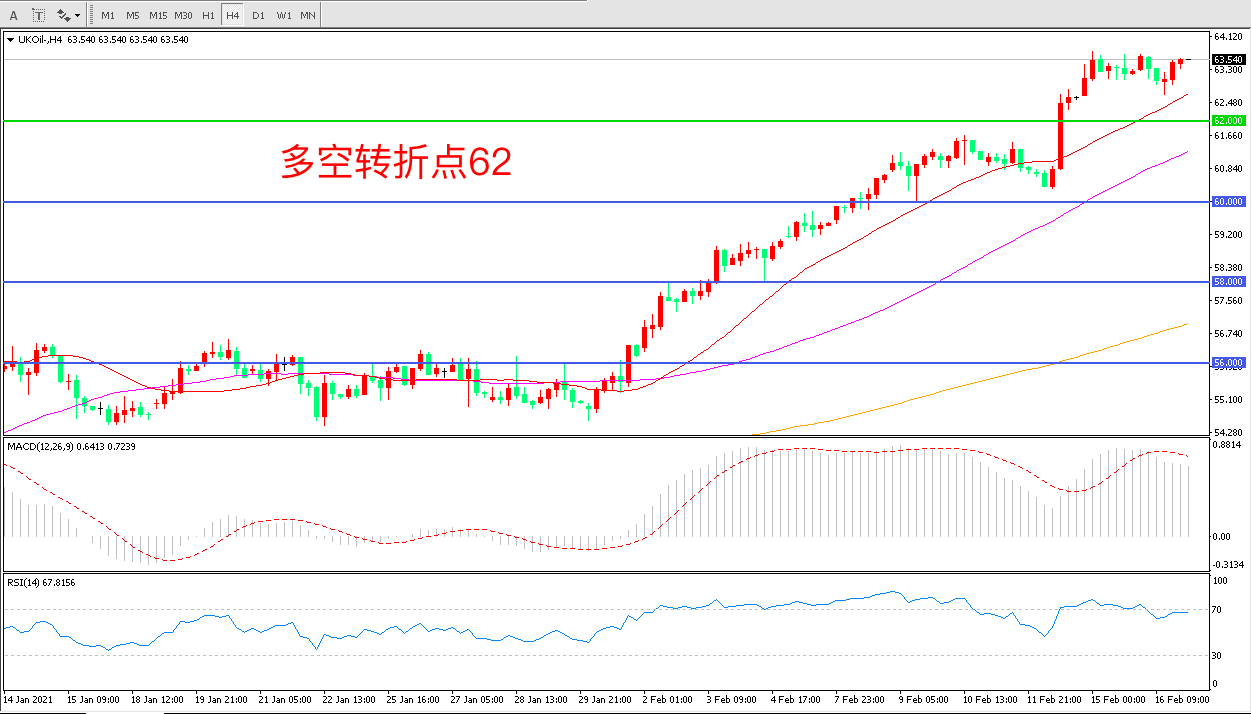 2月16日),历史性冬季风暴袭击美国北美最大的炼油厂被迫关闭,市场担忧得州的极端寒冷天气可能导致油井停产和物流问题,或致供应中断,布伦特原油再度上扬,收报63.54美元/桶。由于市场对美国经济刺激计划将对提振经济及能源需求怀有很大信心,风险情绪氛围良好,刺激原油价格不断走高