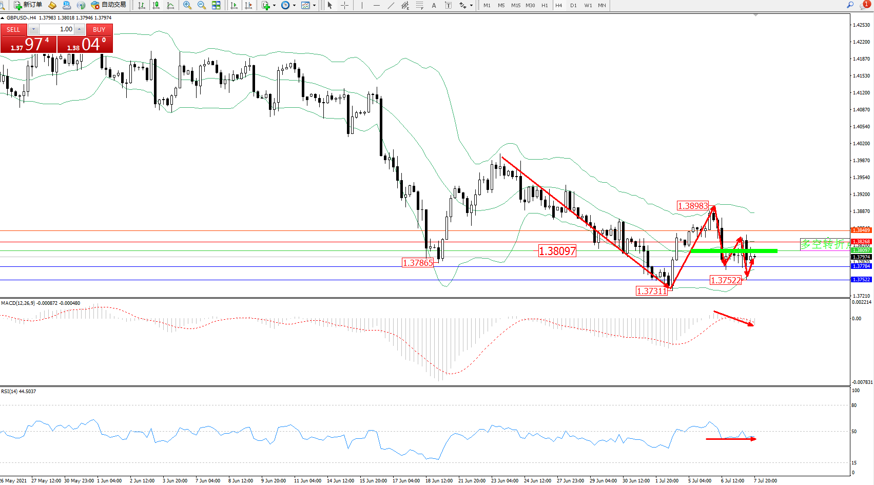 交易策略:1.38097下方看跌,目标1.37784、1.37522