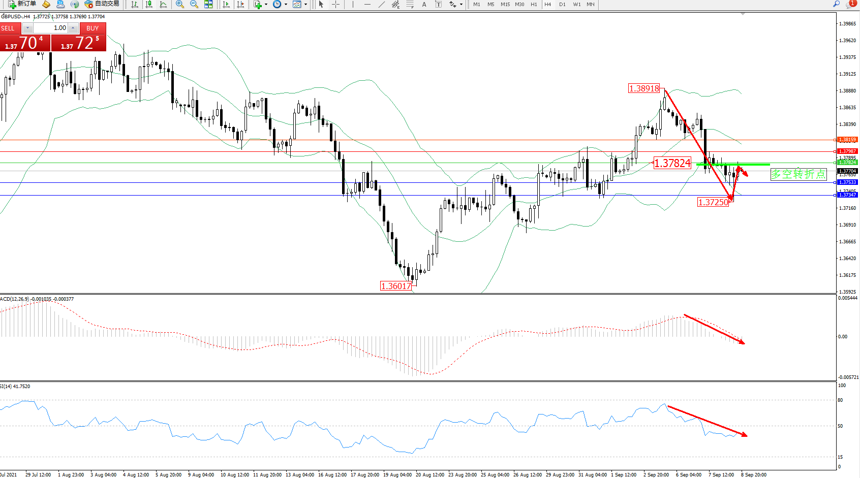 交易策略:1.37824下方看跌,目标1.37533、1.37347