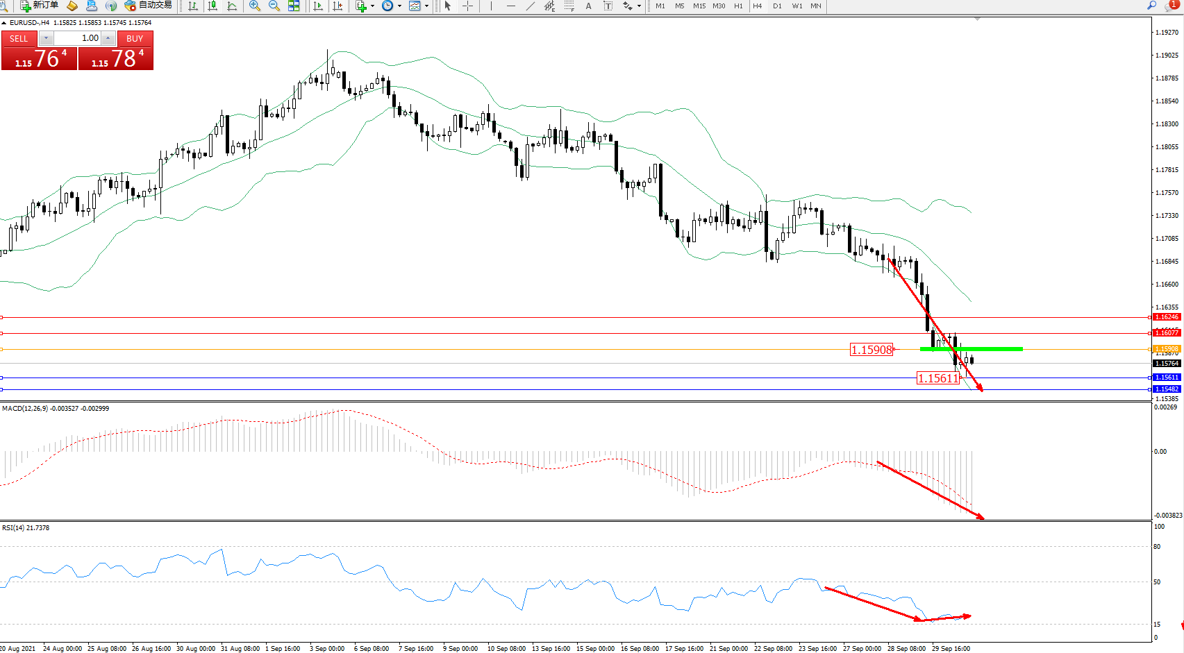 交易策略:1.15908下方看跌,目标1.15611、1.15482