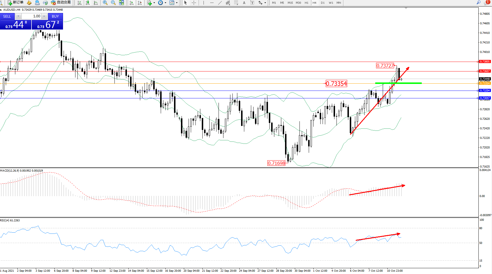 技术点评:多头动力延续布林带指标通道中上轨区间持续震荡上扬,高位抵达0.73727位置遇阻短暂回撤,但上行趋势态势良好,布林带指标呈向上移动走势持续中,且有收口迹象,MACD指标处于多头区域维持震荡向上移动,RSI指标处于多头区域维持整理中;