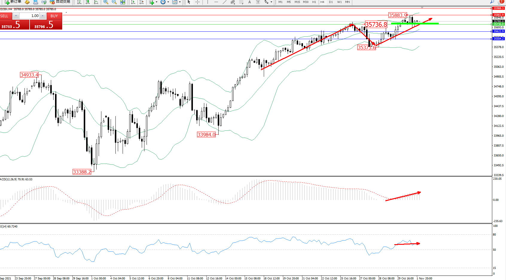 技术点评:多头动力延续布林带指标通道内维持窄幅整理持续上扬,高位抵达35883位置节点后开始徘徊,短期多头动力有继续拉升上扬态势,布林带指标呈张口走势后开始缓慢收口向上移动,MACD指标处于0轴线上方弱势徘徊中,RSI指标处于多头区域维持整理持续平移;