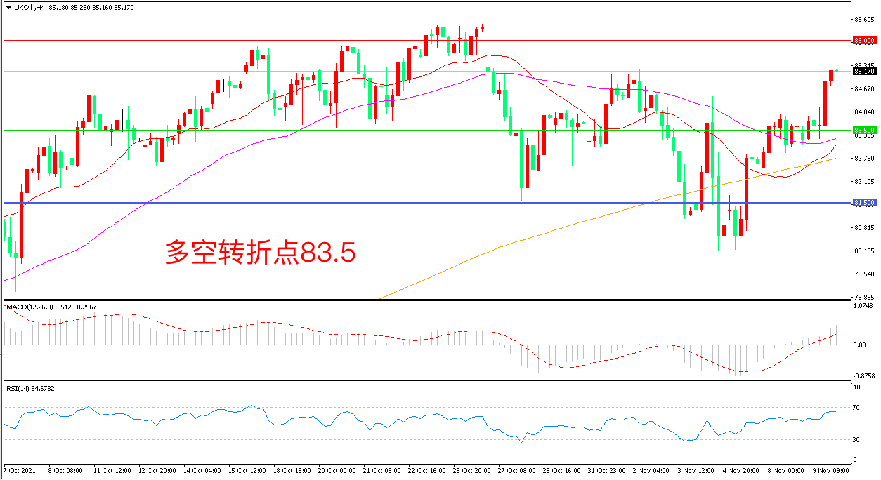 4小时图看,油价在低位调整后长阳连续拉升,短期走势偏强,83.5美元成为支撑,86成为阻力,MACD红柱增加,RSI指标走平,日内震荡上行概率较大。