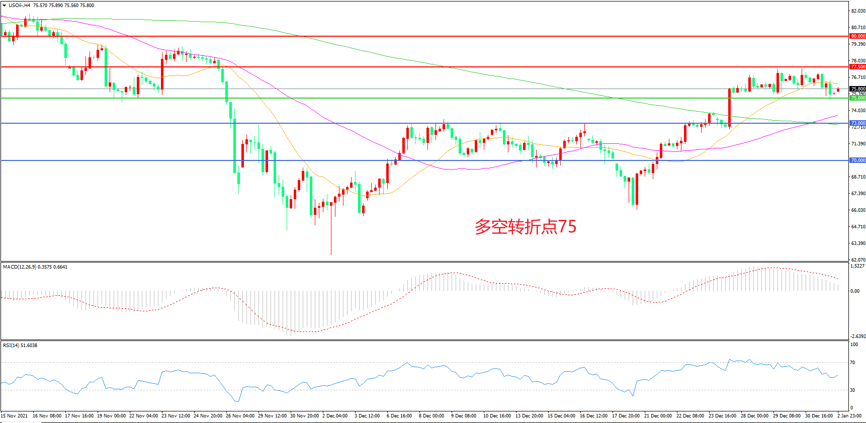 交易策略:在75.00之上看涨,目标77.50        80.00