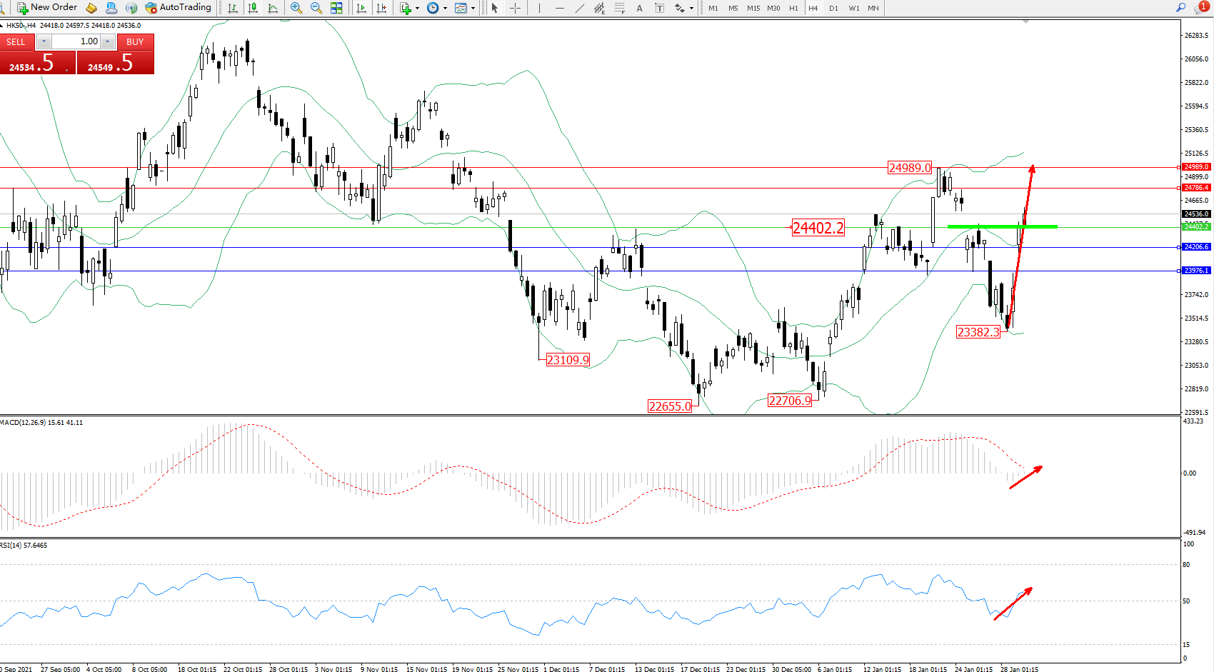 恒指HK50 ——4小时K线图显示: