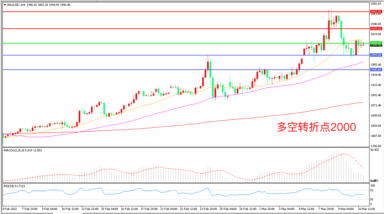 周四(3月10日),俄乌外长自俄动武后的首次会谈无果而终,美国CPI超预期增长续创四十年来增速新高,现货黄金维持在2000美元关口上方,窄幅震荡后收报1996.48美元/盎司。目前市场预计通胀的峰值还未出现。不少人现在担心通胀持续攀升将削弱经济增长,引发滞胀风险,地缘危机与“爆表”的通胀将继续为金价提供支撑。