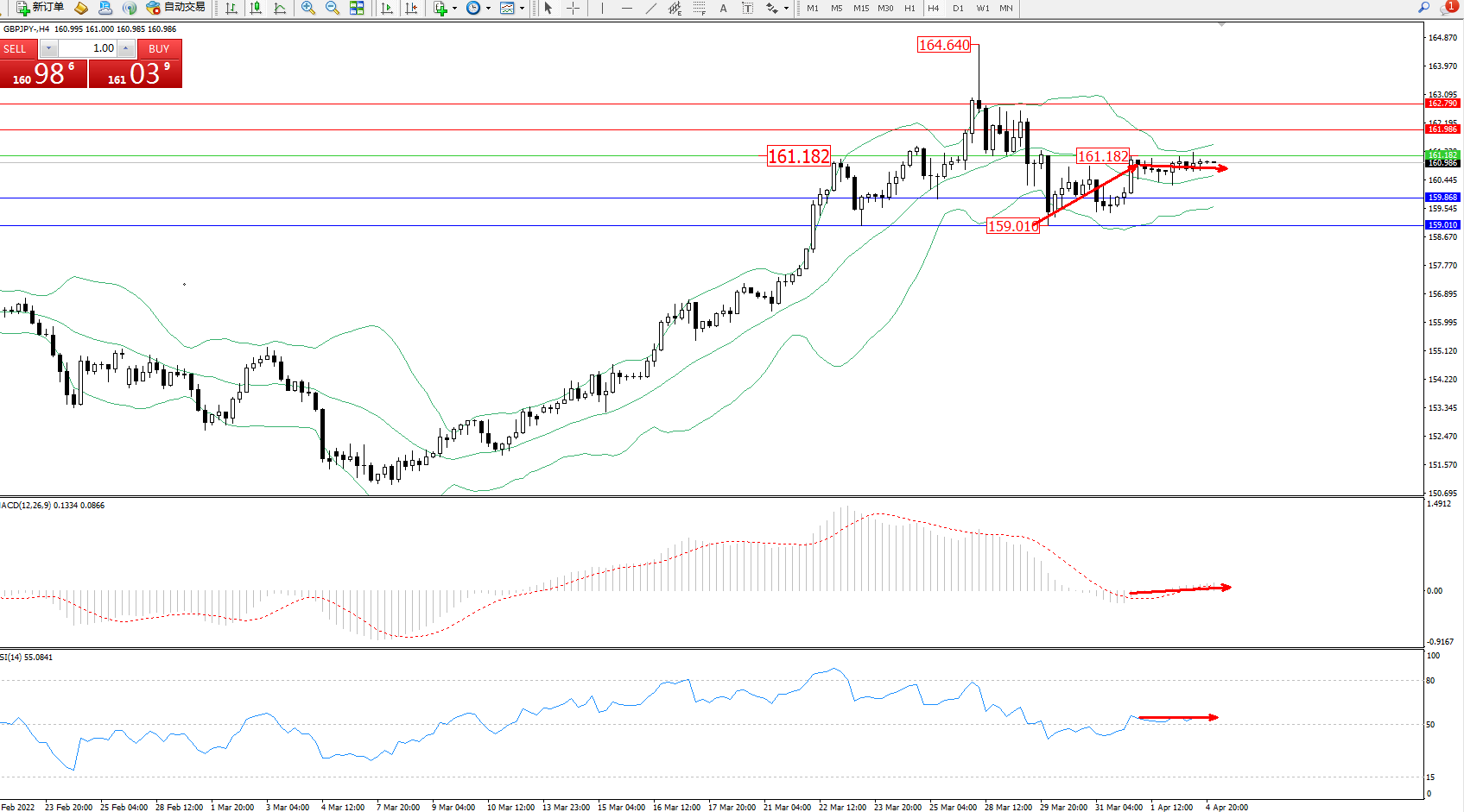 备选策略:161.182上方看涨,目标161.986、153.790