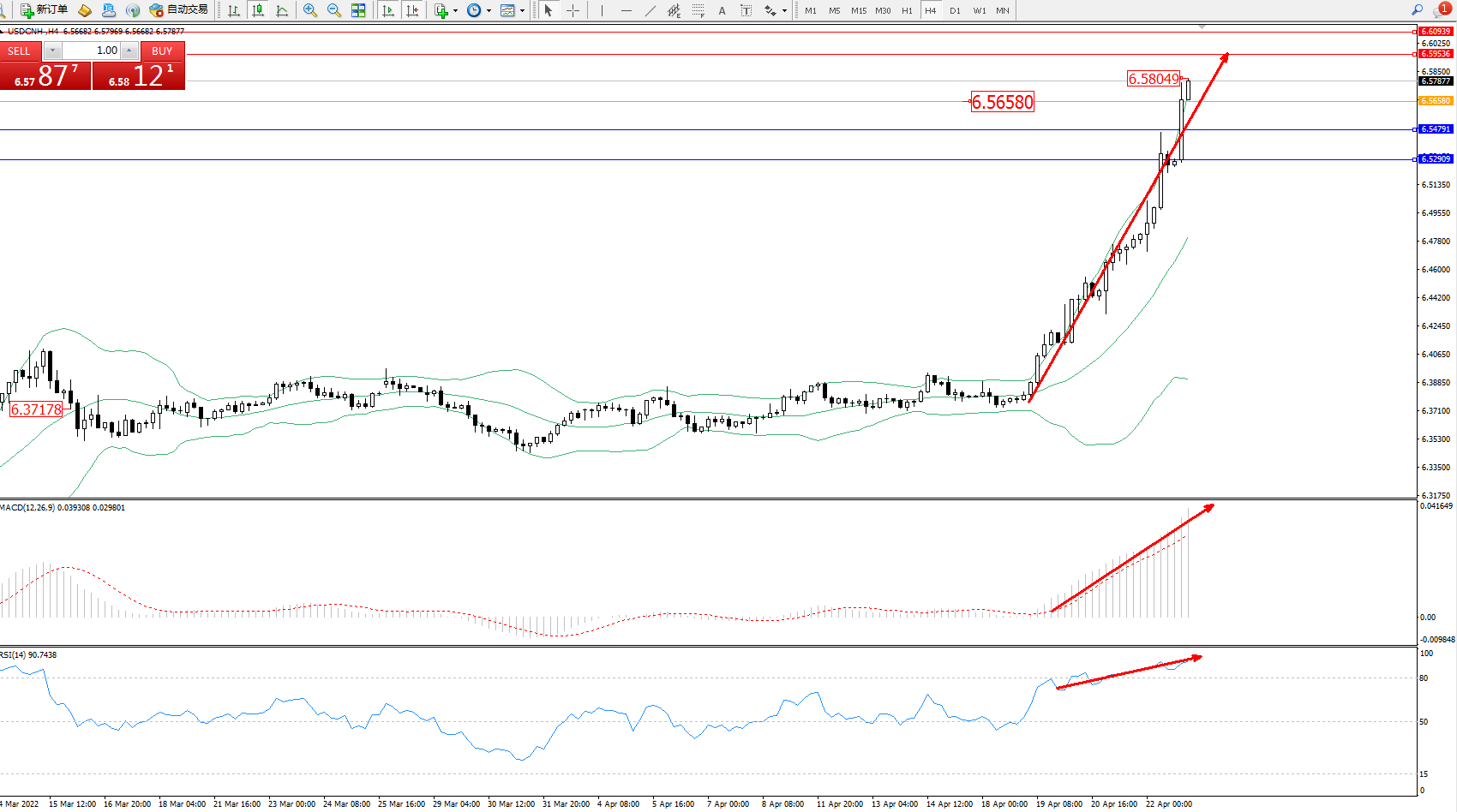 美元人民币USDCNH——4小时K线图显示: