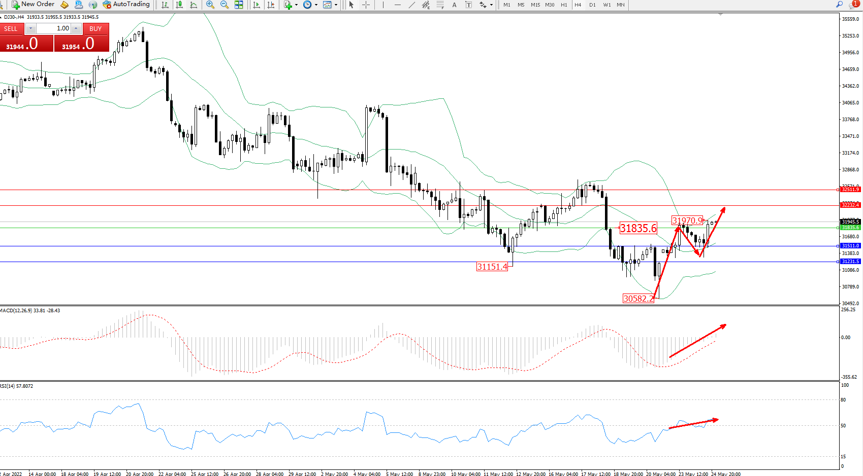道琼斯指数DJ30——4小时K线图显示: