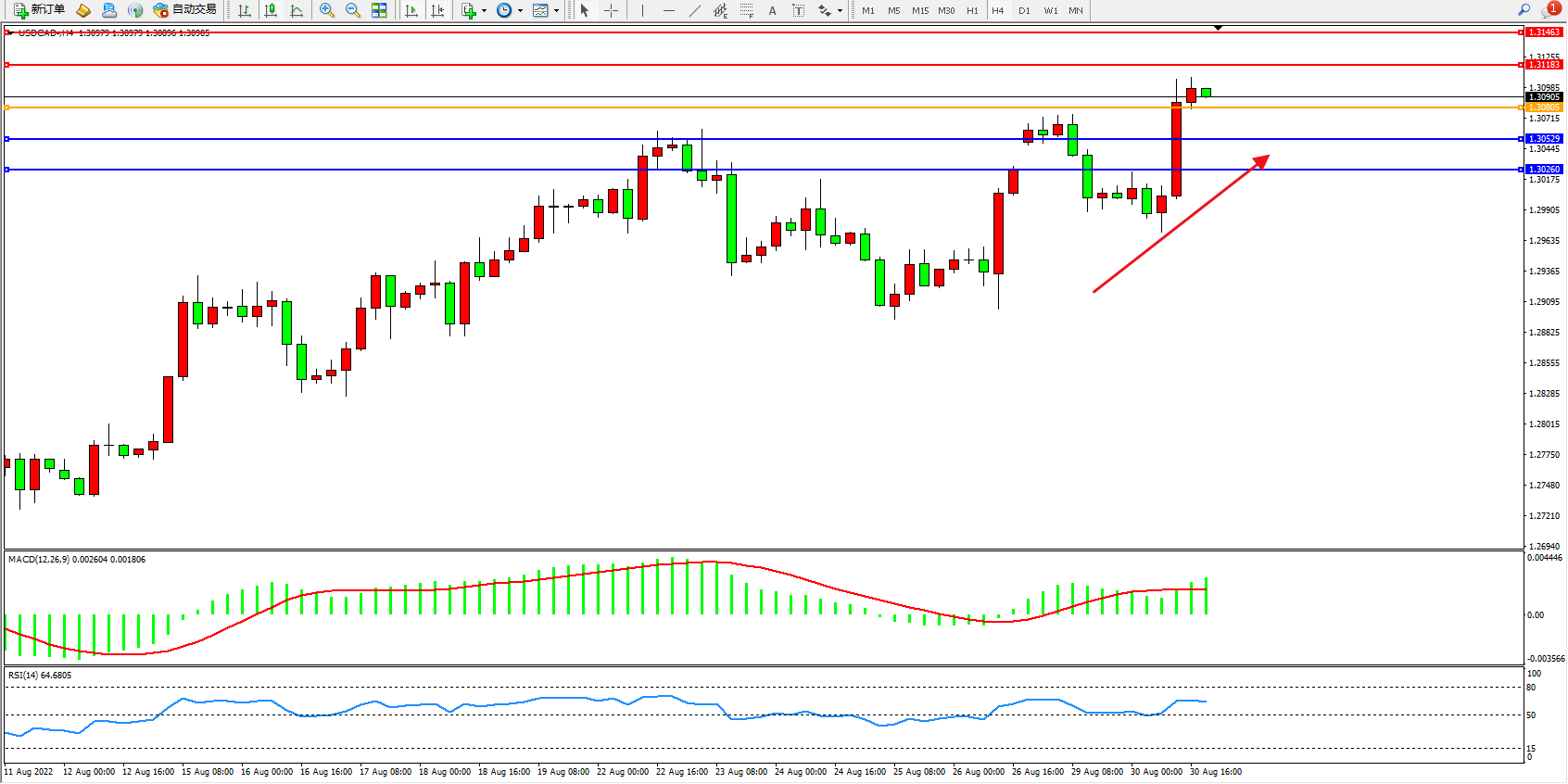 美元加元USDCAD——4小时K线图显示: