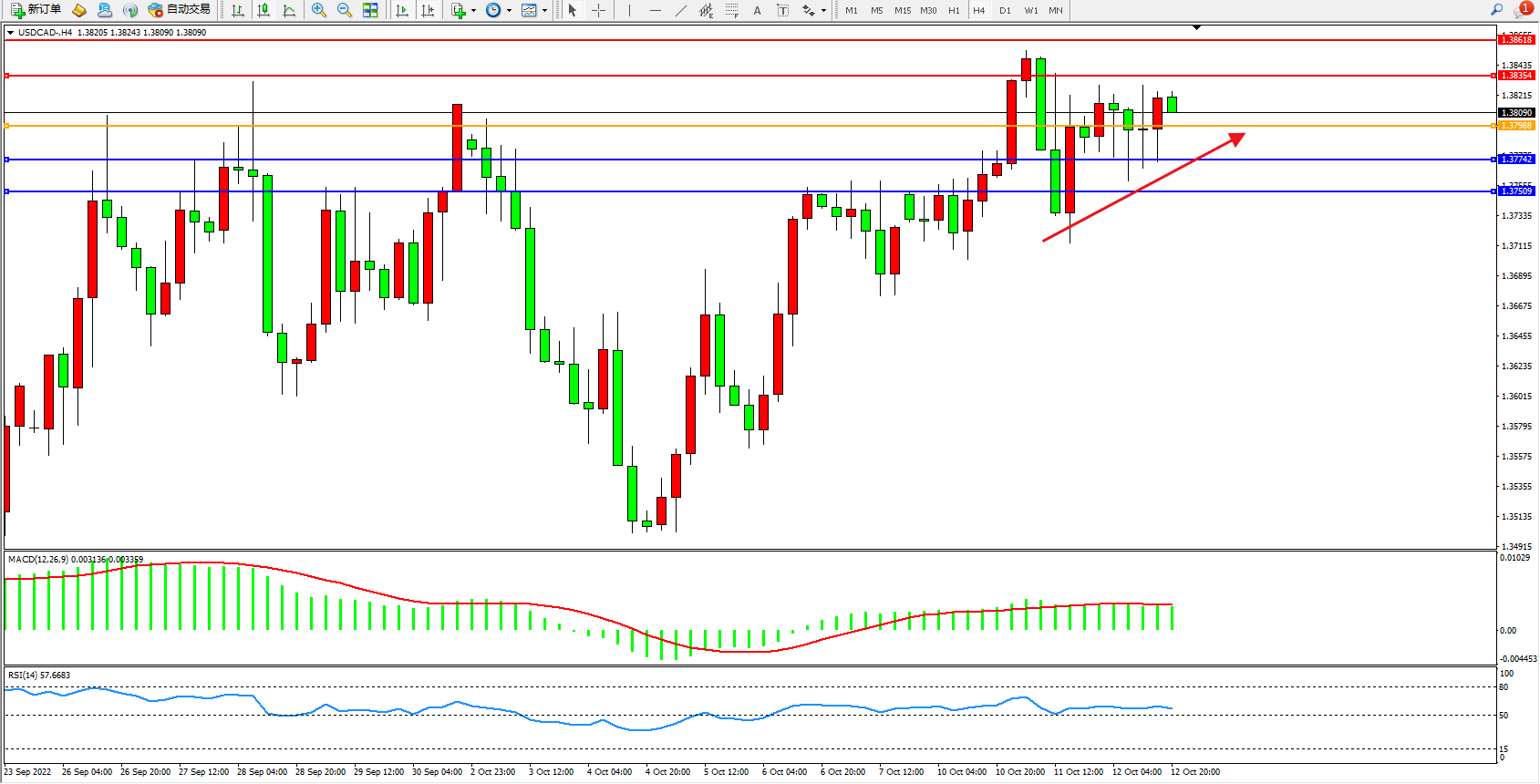 美元加元USDCAD——4小时K线图显示: