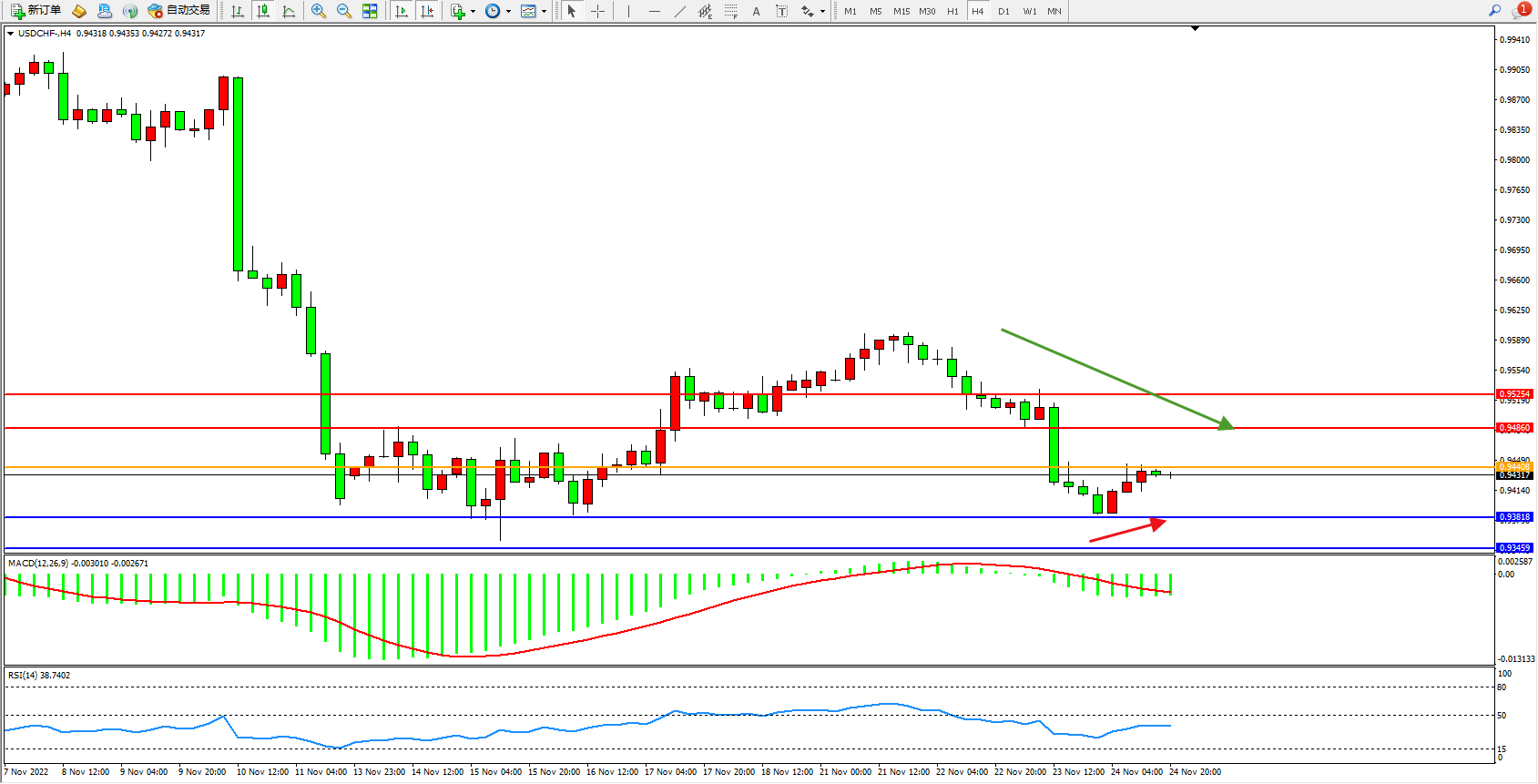 交易策略:0.94408下方看跌,目标0.93818、0.93459