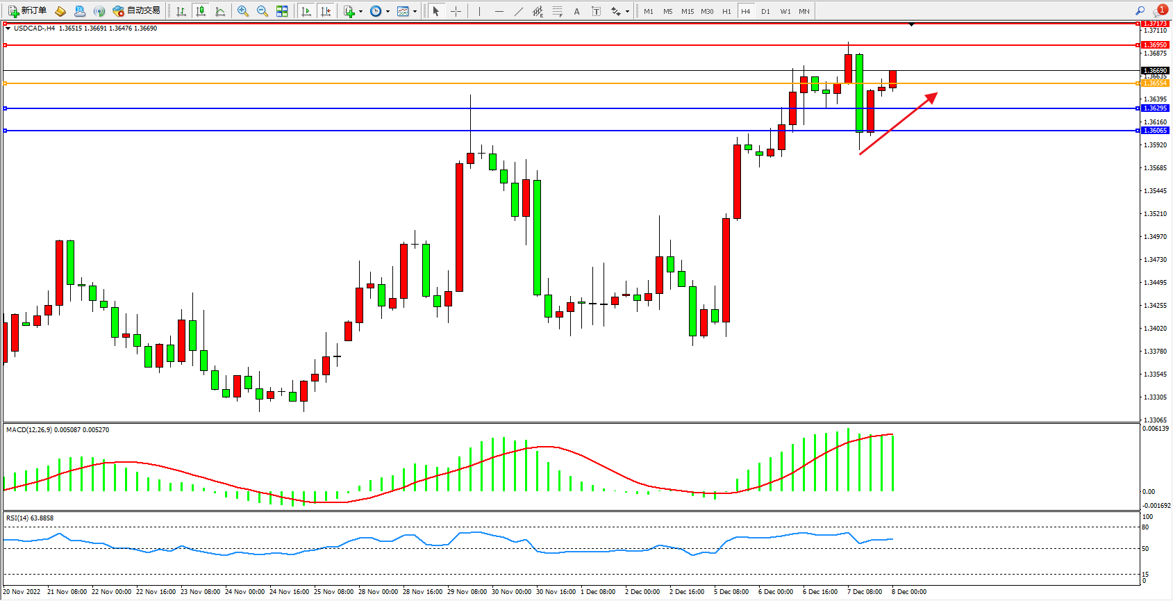 美元加元USDCAD——4小时K线图显示: