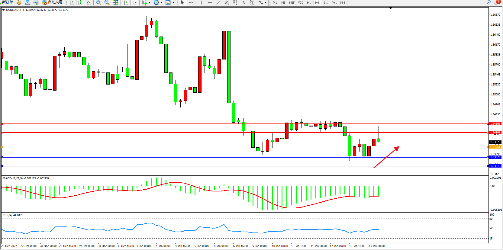 美元加元USDCAD——4小时K线图显示: