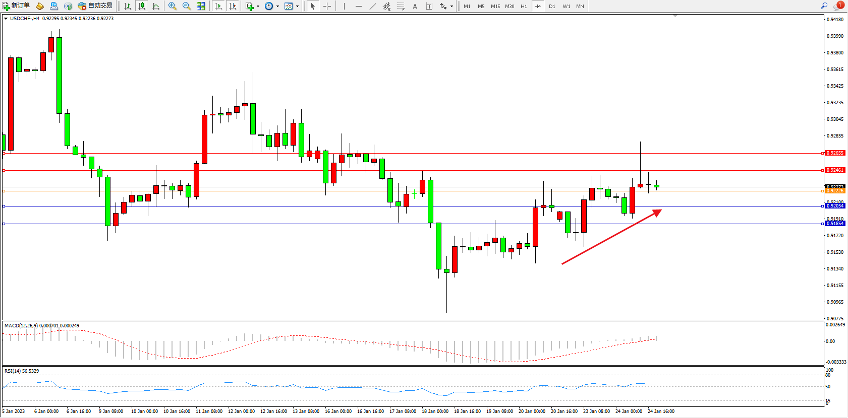 交易策略:0.92226上方看涨,目标0.92461、0.92655