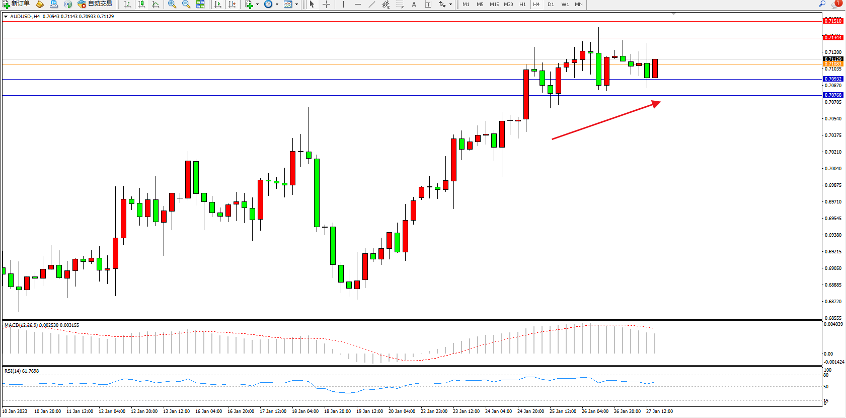 澳元美元AUDUSD——4小时K线图显示: