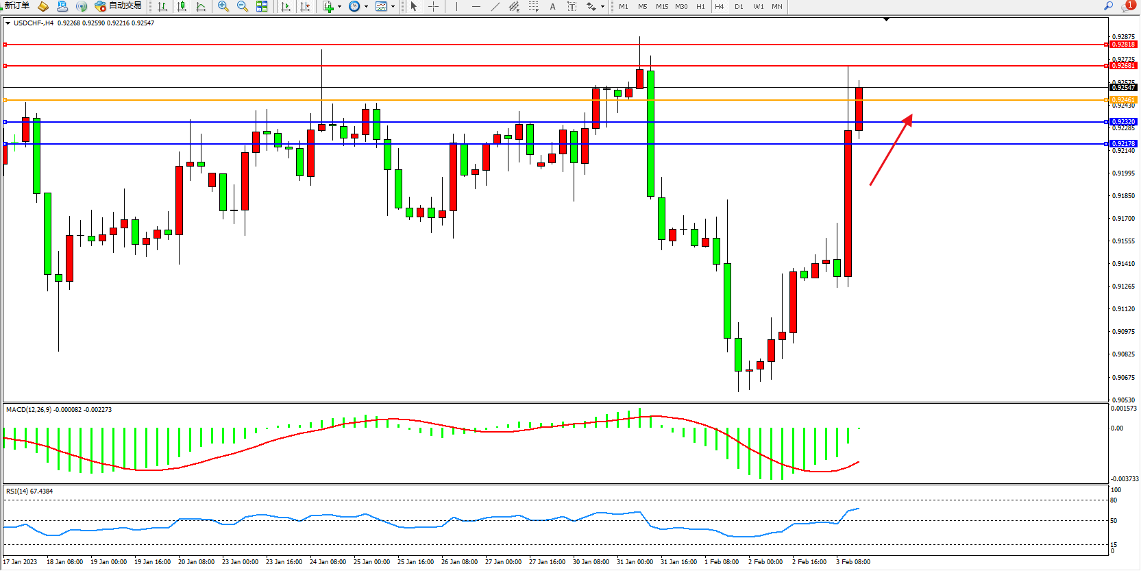 交易策略:0.92461上方看涨,目标0.92681、0.92818