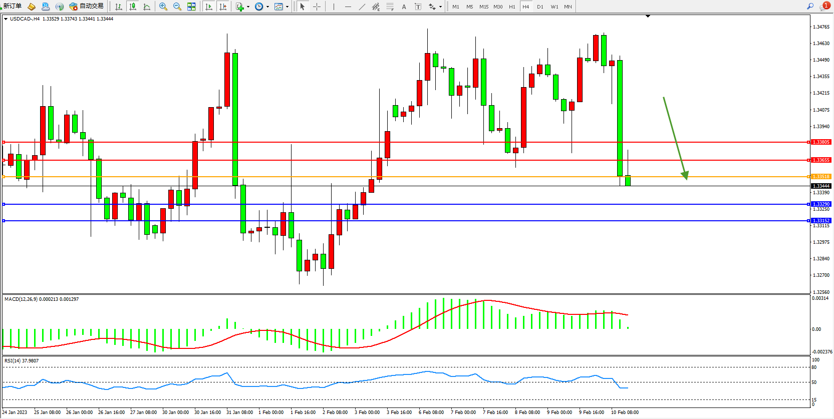 美元加元USDCAD——4小时K线图显示: