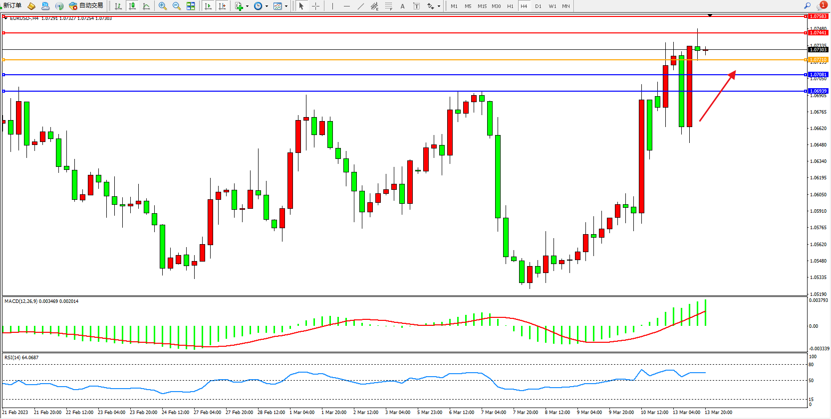 4小时图看:高位多头动力持续宽幅巨震上移,短期看涨情绪涌现,市场整体处于不断攀升中,MACD指标处于多头区域高位上移,RSI指标处于多头区域高位徘徊;