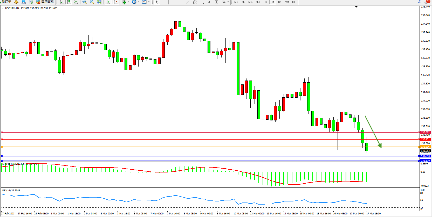 交易策略:131.836下方看跌,目标131.390 131.170