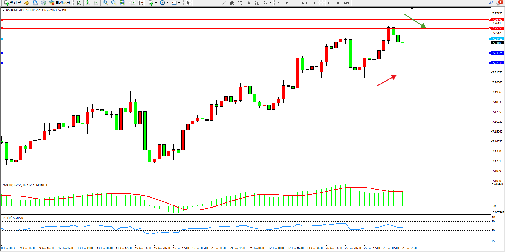 美元人民币USDCNH——4小时K线图显示: