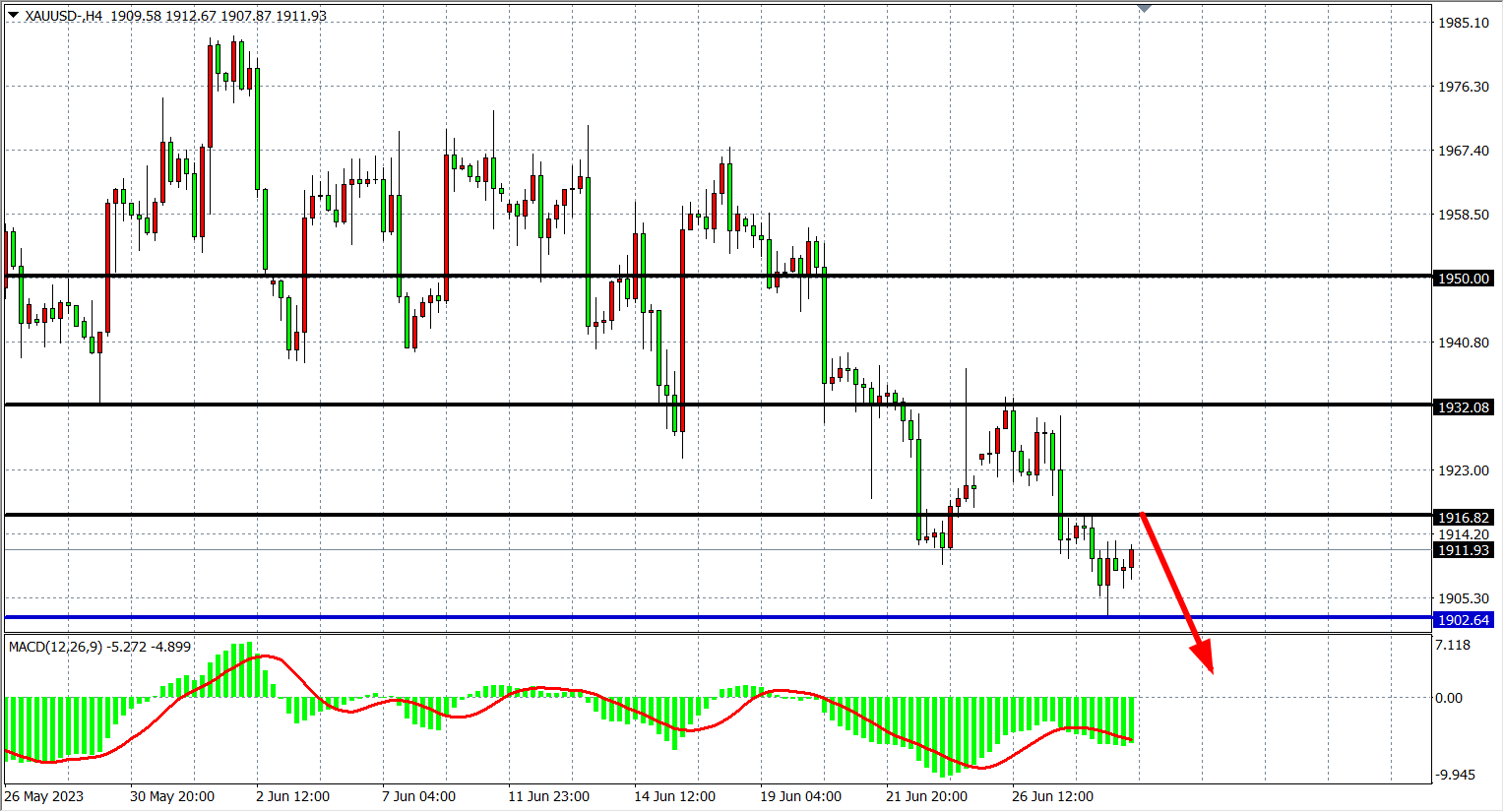 周三(6月28日)鲍威尔重申鹰派立场,称今年有必要再加息两次,不排除连续加息,受累于此现货黄金日内大幅下挫,跌破1910关口并触及近4个月来新低,最终收跌0.32%。