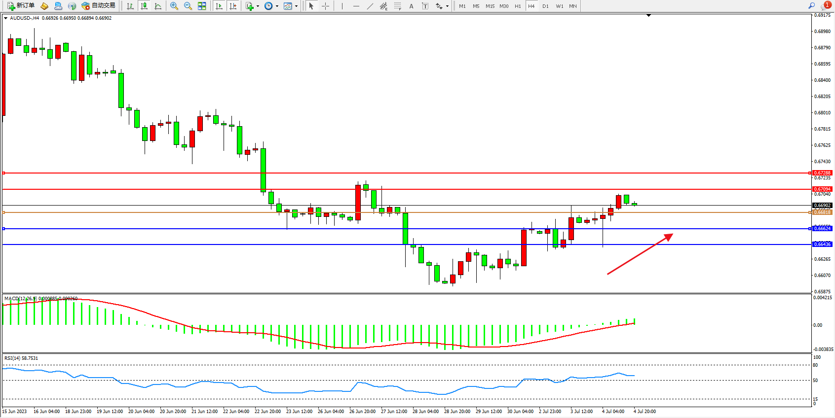 交易策略:0.66818上方看涨,目标0.67094 0.67288