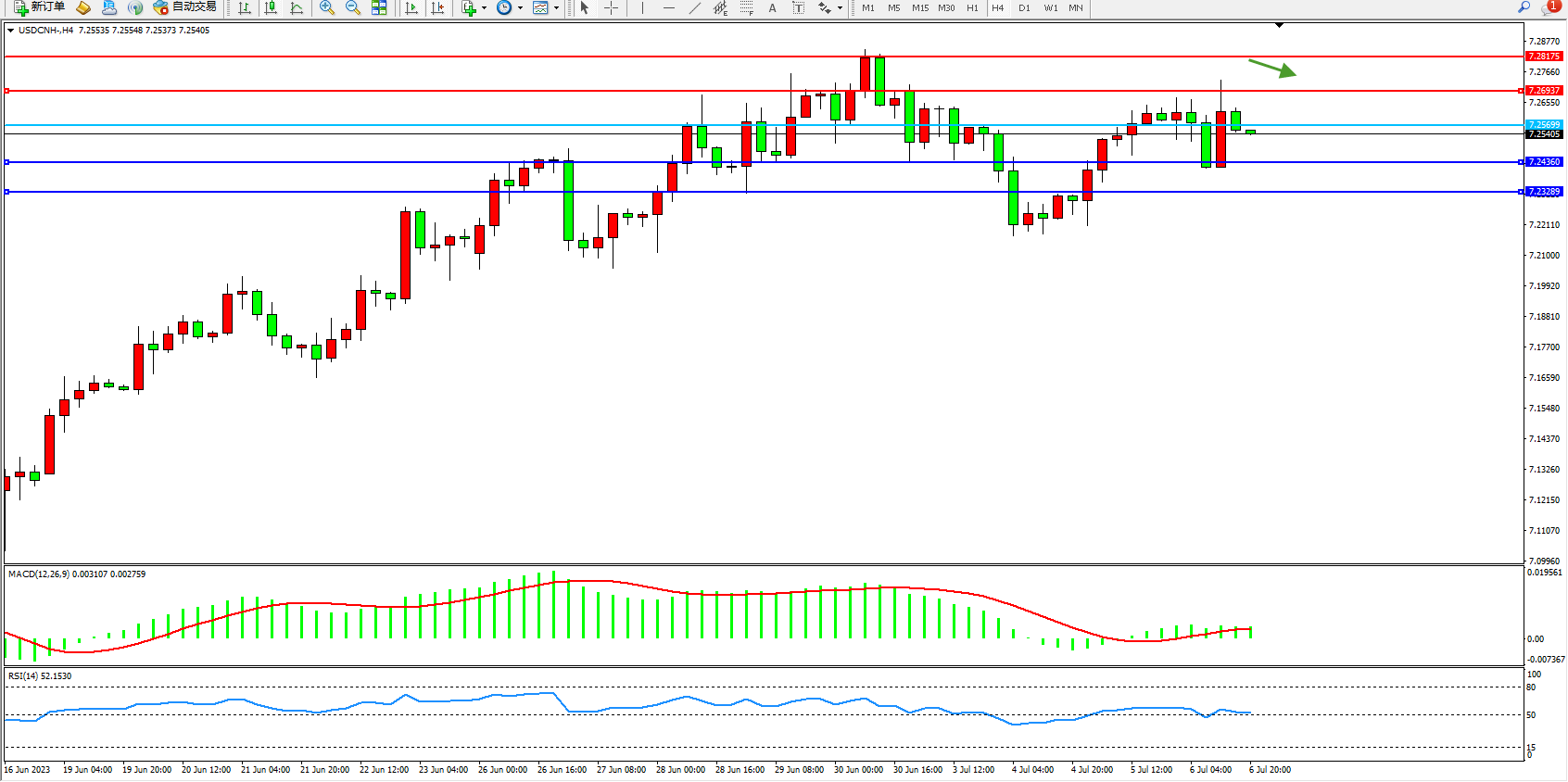 美元人民币USDCNH——4小时K线图显示: