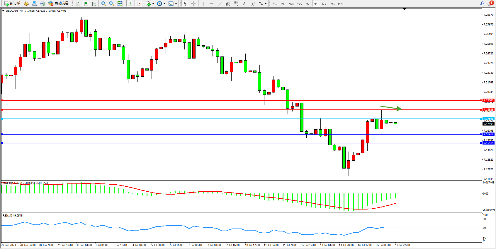 交易策略:7.17999下方看跌,目标7.16412  7.15514